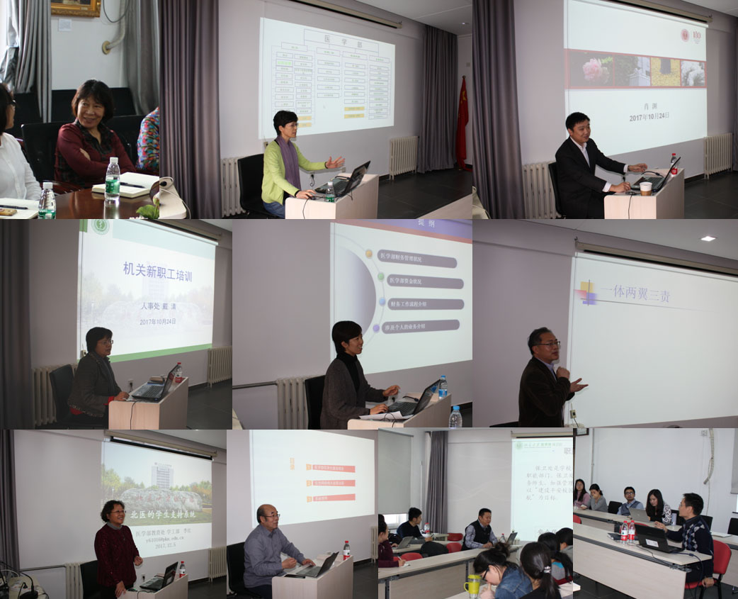 新职工培训每两周一次,16课时。培训内容包括国情国策、校史校情、廉政、网络信息安全教育等。在校史校情培训部分,主要通过组织新职工观看《生死相托——北医的一个世纪》,让新职工全面了解北医的厚重历史;通过邀请两办、纪检、人事、财务、设实、教育、保卫、信息通讯中心、房产等部门领导为新职工介绍医学部的人、财、物管理,廉政教育,行文规范、突发事件信息报送、校友、筹款募资,学生工作,公寓房管理,网络信息安全、校园安全等相关工作,及组织新职工参观基础医学院解剖陈列馆,使新职工全面了解北医的现状和基本情况。在国情国策教育部分,主要通过组织新职工参观在北京展览馆举办的砥砺奋进的五年”辉煌成就展,使新职工全面了解党的十八大以来我国发生的历史性变革和取得的辉煌成就,增强新职工的使命感和责任意识。此外,还组织召开了新职工座谈会,交流心得体会,听取新职工对培训工作的意见建议,同时分管领导也给新职工提出工作要求。