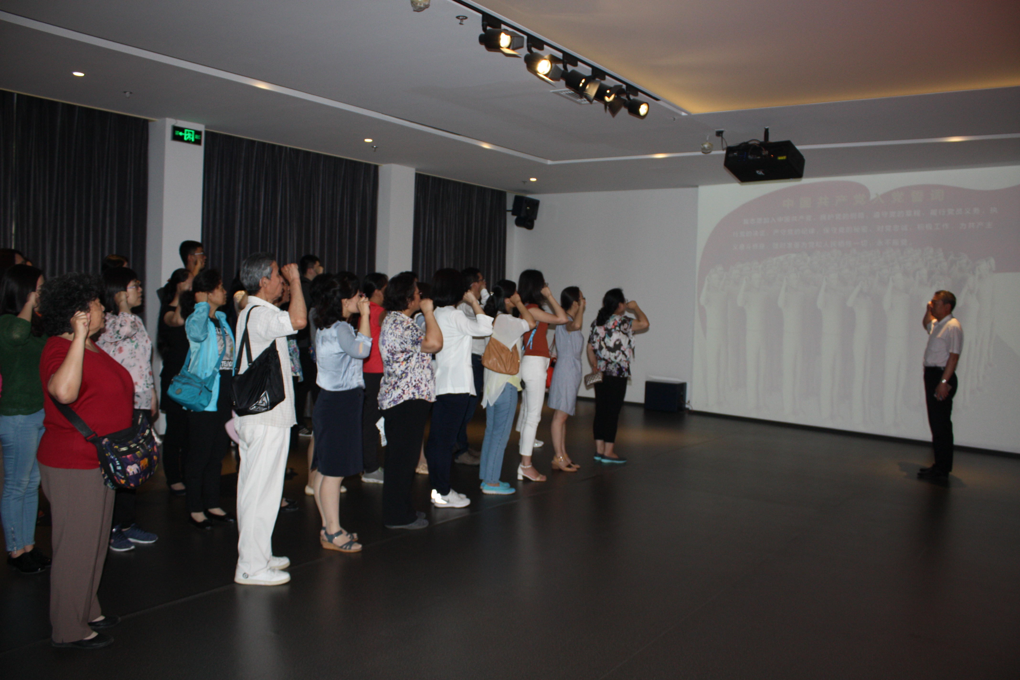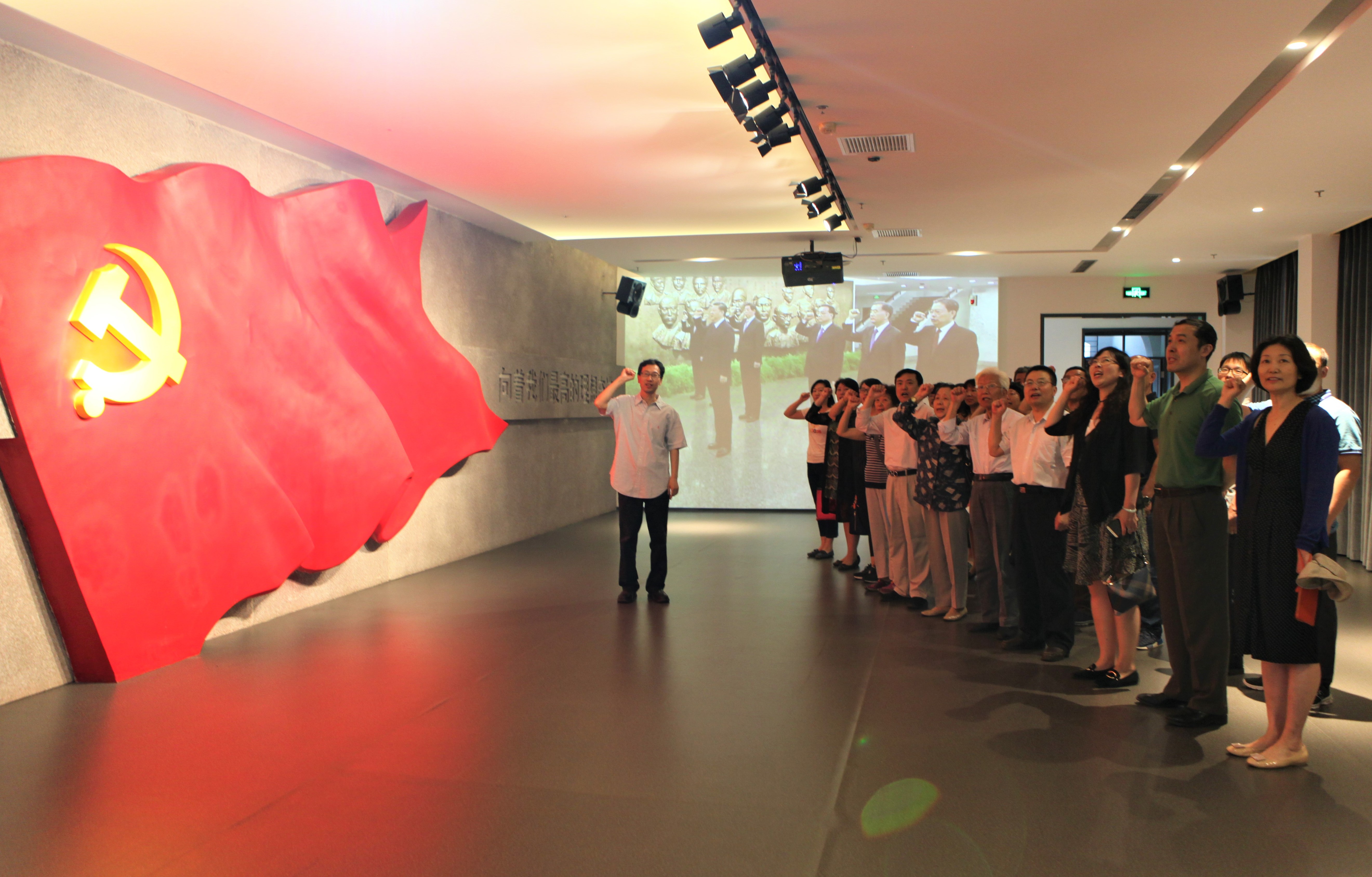 参观活动结束后,在肃穆的宣誓大厅,两组参观队伍分别由产业办吕廷煜主任、后勤党委赵成知书记领誓,党员们们面对党旗,进行了庄严宣誓,“我志愿加入中国共产党!……”
